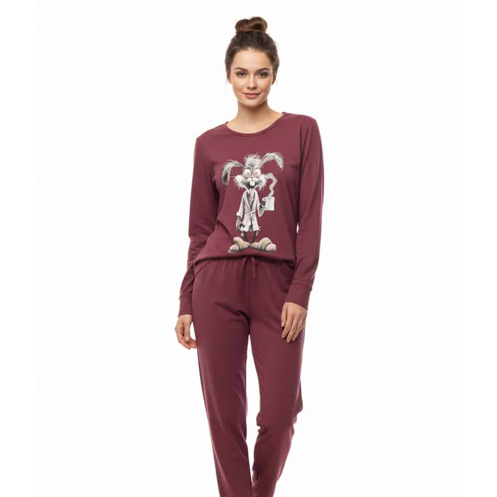 Ζεστή και απαλή γυναικεία βαμβακερή πιτζάμα σε μοντέρνο μπορντό χρώμα, διακοσμημένη με όμορφη στάμπα για παιχνιδιάρικο και χαρούμενο στυλ.