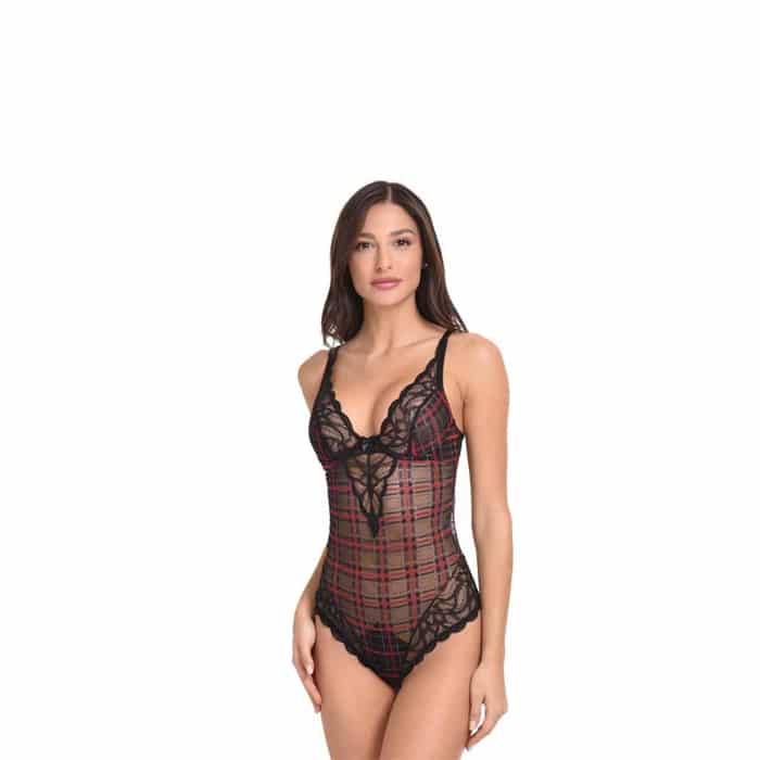 Αισθησιακό κορμάκι Miss Rosy ελληνικής ραφής, σε καρό σχέδιο με διακριτικές κόκκινες και χρυσές λεπτομέρειες. Διαθέτει μπανέλες για σταθερό κράτημα, ρυθμιζόμενες τιράντες και κλείσιμο στο πίσω μέρος όπως τα σουτιέν.