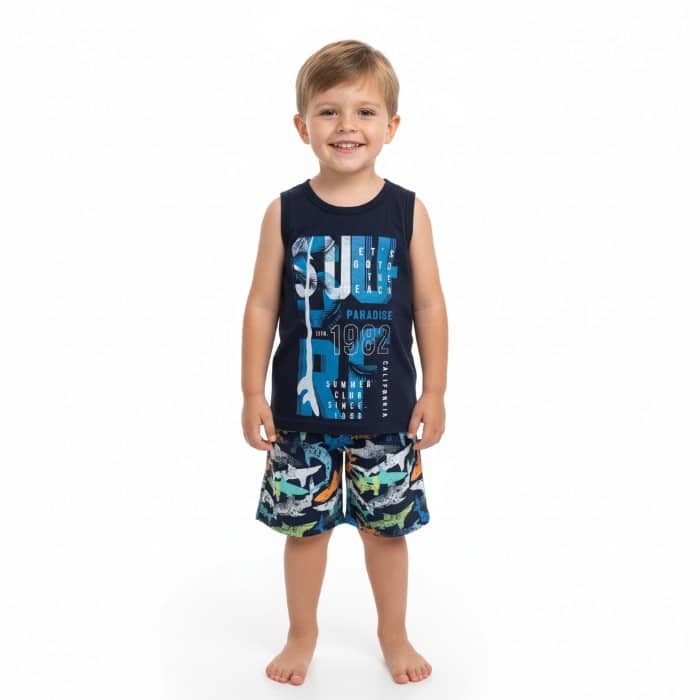 Παιδικά Καλοκαιρινά Ρούχα Paradise Pretty Baby. Το σετ 2 τεμαχίων της Pretty Baby ντύνει κάθε μικρό αγόρι, από το πρωί μέχρι το βράδυ. Κατασκευασμένο από 100% πενιέ βαμβάκι με ψιλή πλέξη, αφήνει το δέρμα να αναπνέει. Η μαλακή μπλούζα με ελαστική λαιμόκοψη και διακοσμητικό καλοκαιρινό print χωρίς τοξικά χρώματα συνδυάζει τέλεια με το κοντό παντελονάκι. Για απόλυτη ελευθερία κινήσεων. Χάρη στην υψηλή ποιότητα του υφάσματος, το σετ διατηρεί την ελαστικότητα και τη φόρμα του. Ακόμα και μετά από πολλά πλυσίματα. Φόρεσέ το σαν ρούχο ή σαν πιτζάμα το σετ  είναι προσαρμόσιμο στις ανάγκες σας.