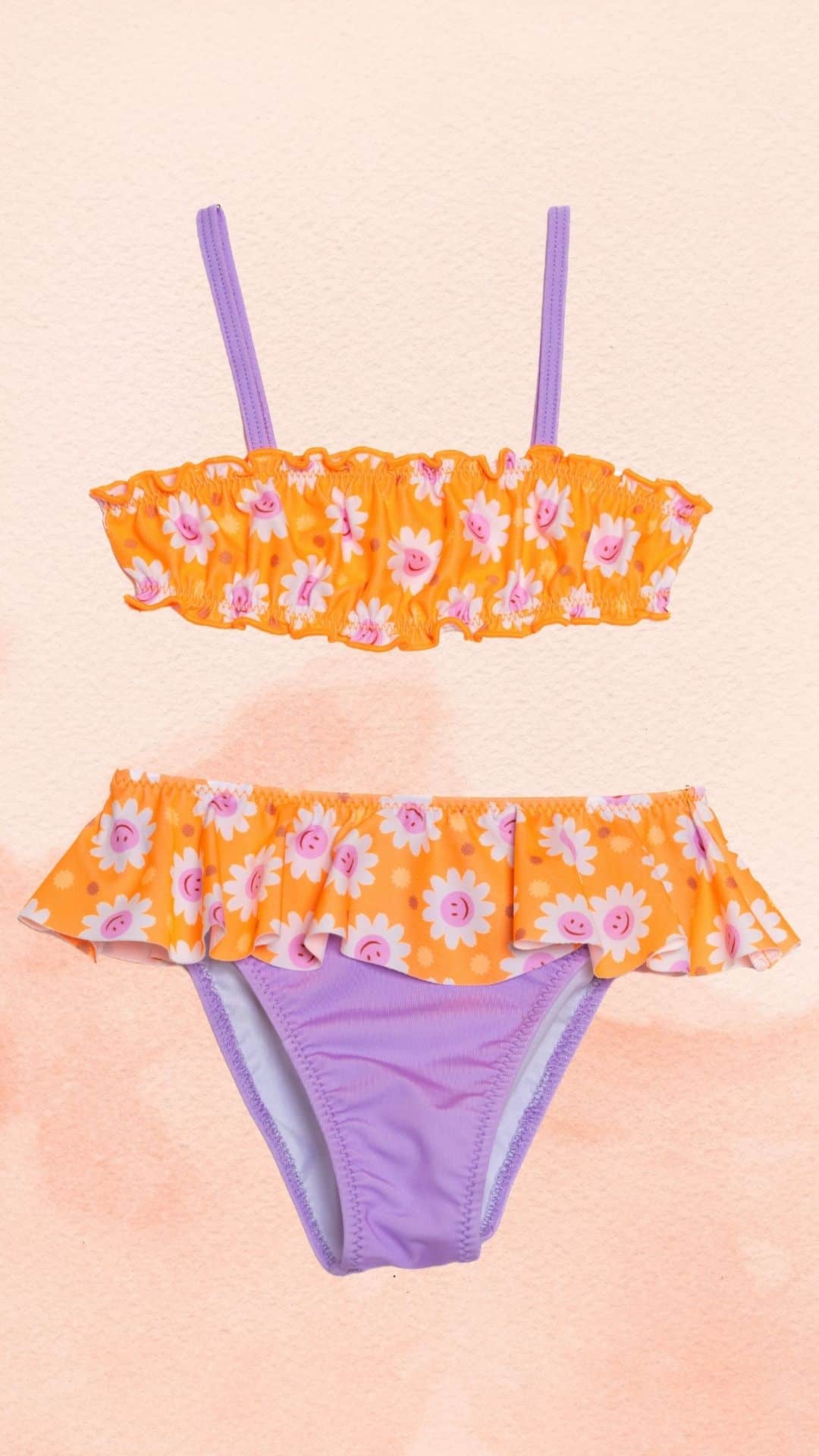Παιδικό Σέτ Μαγιό με Μαργαρίτες Tortue. Χαρίστε στη μικρή σας το πιο χαρούμενο μαγιό του καλοκαιριού! Το παιδικό μπικίνι μαγιό Tortue συνδυάζει παιχνιδιάρικα χρώματα πορτοκαλί και μωβ, με διακοσμητικές μαργαρίτες που θα λατρέψει. Κατασκευασμένο από 85% polyester και 15% elastane, προσφέρει άνεση, αντοχή και ελευθερία κινήσεων, ιδανικό για παιχνίδι στην άμμο και ατελείωτες βουτιές. Επιλέξτε ποιοτικά παιδικά μαγιό που ξεχωρίζουν!