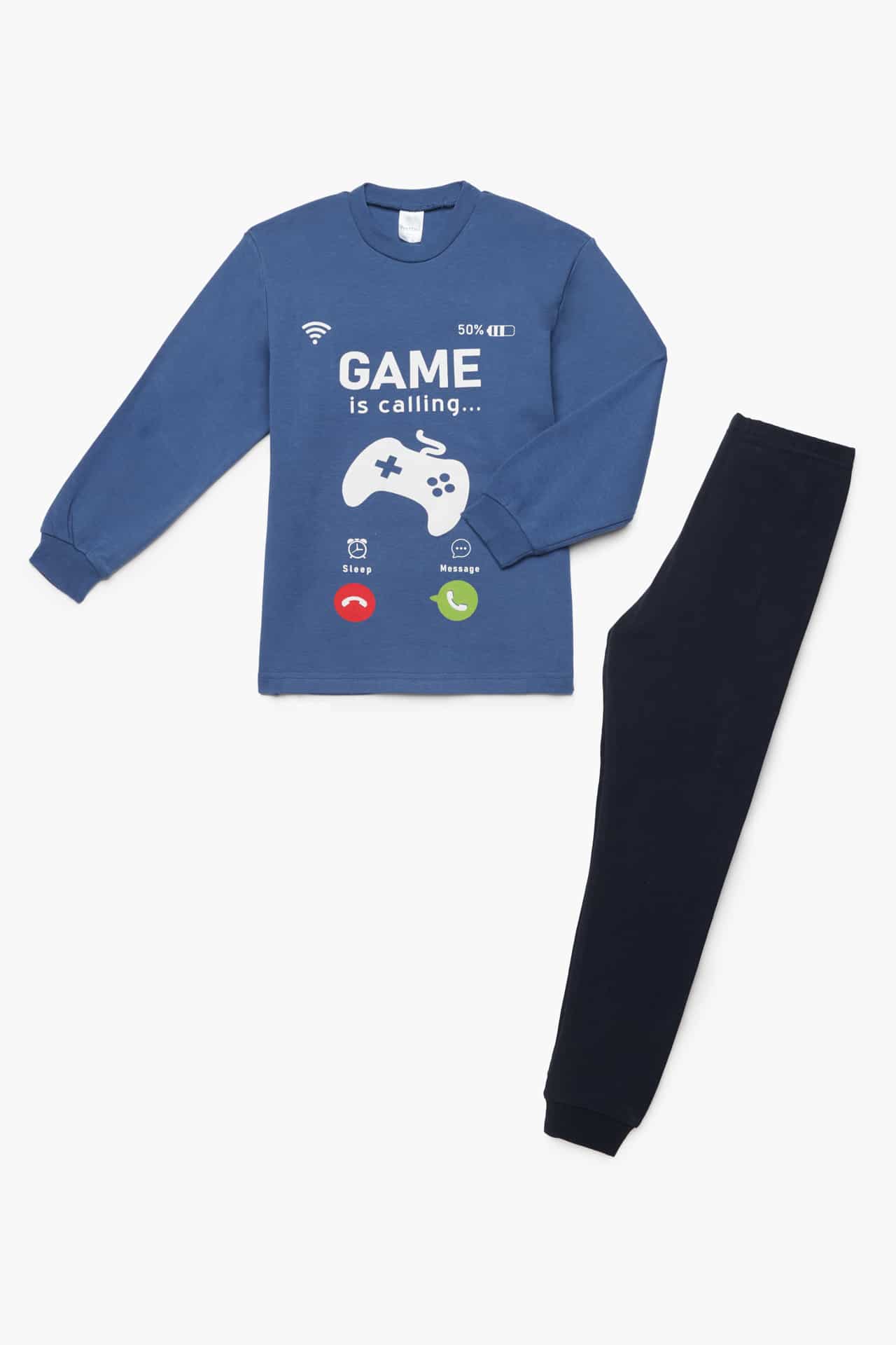 Παιδική χειμερινή πιτζάμα με το δυναμικό τύπωμα “Game “! Κατασκευασμένη από 100% βαμβακερό ύφασμα, αυτή η πιτζάμα συνδυάζει ζεστασιά και άνεση, ιδανική για τις κρύες νύχτες. Η μακρυμάνικη μπλούζα με το εντυπωσιακό τύπωμα “Game “, ενώ το παντελόνι προσφέρει άνεση και ελευθερία κινήσεων. Το βαμβακερό υλικό εξασφαλίζει απαλότητα και αναπνοή, κάνοντάς την την τέλεια επιλογή για παιχνίδι και ξεκούραση.